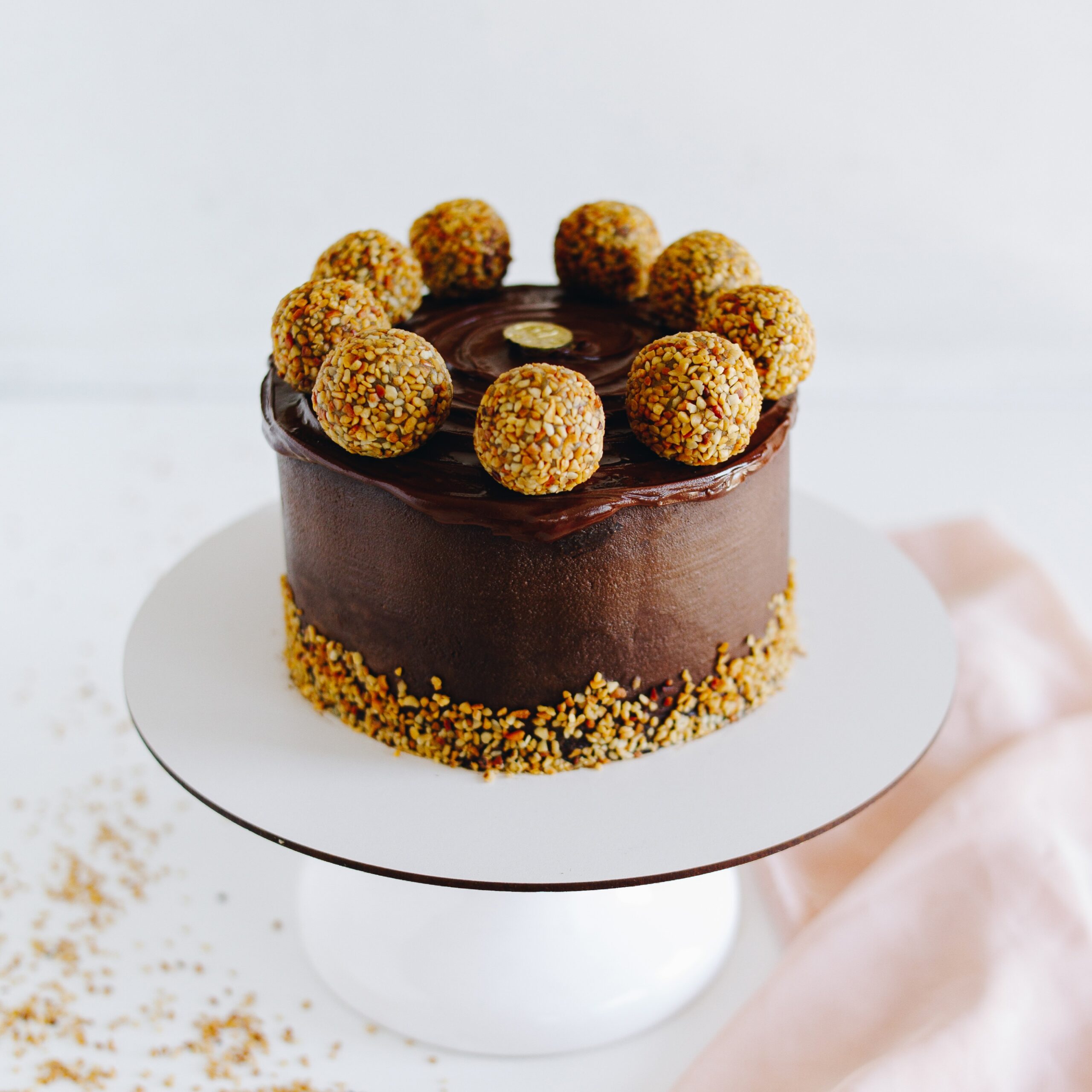 Massa de chocolate recheada e coberta com brigadeiro e creme de avelã crocante. Finalizado com brigadeiros.